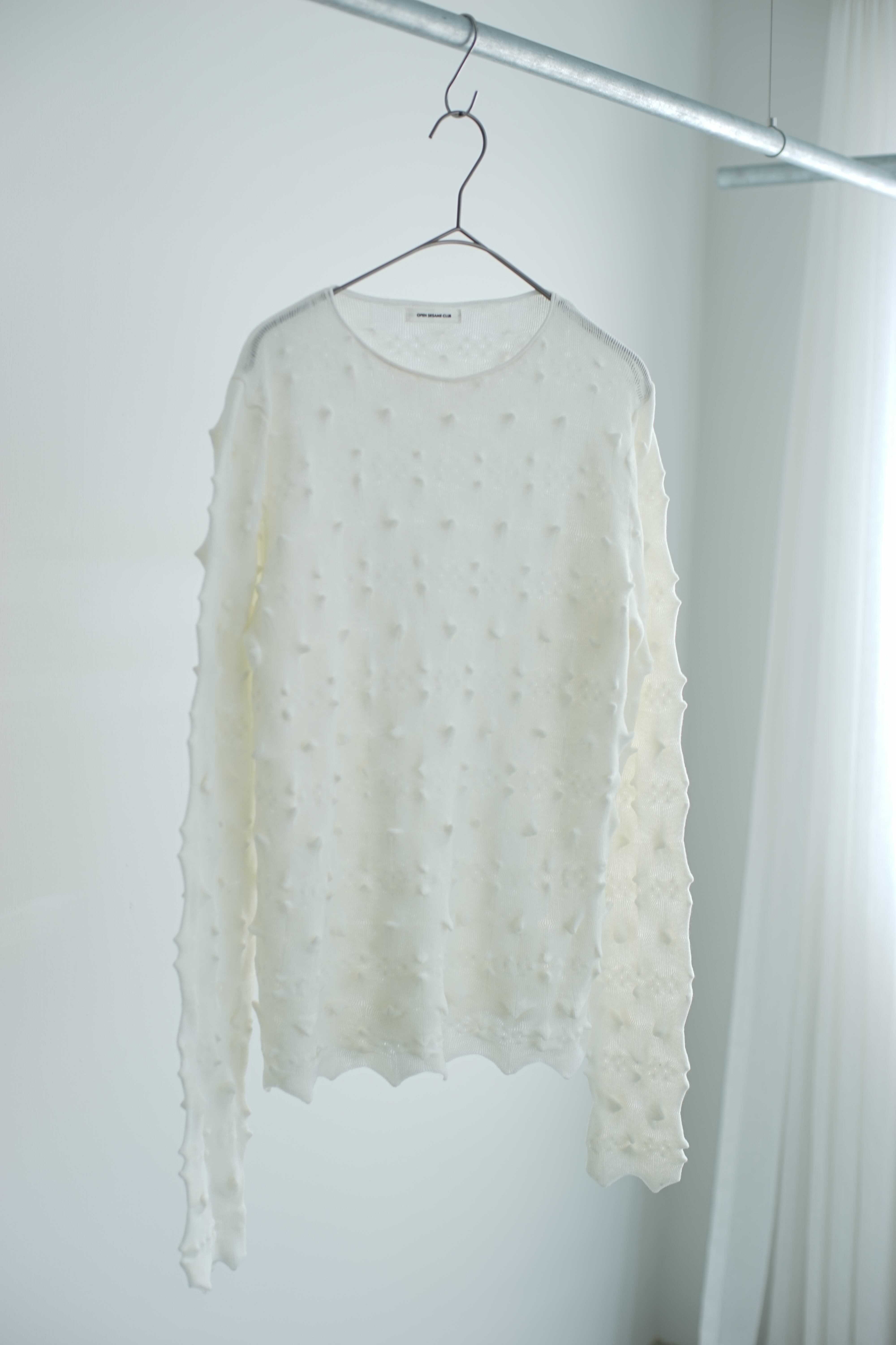 ハイツイストコットンを使用したニットプルオーバーです。 定番のdurianの編み地をランダムに変化させ表情感のある編み地に仕上げました。編み地がより際立つように微配色の配色にしています。また編み地を生かしスッキリとしたバランスのシルエットにしています。素材はコンパクトスピンという毛羽を抑える技術によって紡績しさらに糸に入る撚りを2倍に高めたハイツイストコットンを使用しています。シャリっとした肌触りが特徴的で端境期に着用して頂きやすい素材感になります。素材に天然有機系のデオドラント加工が施されていますので、汗を各時期でも日除けとしても着用してもいただけます。